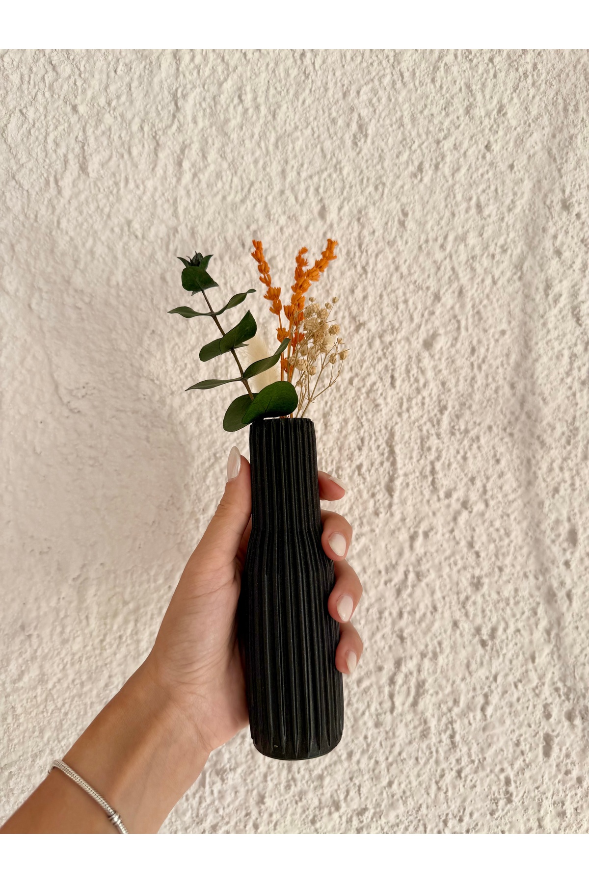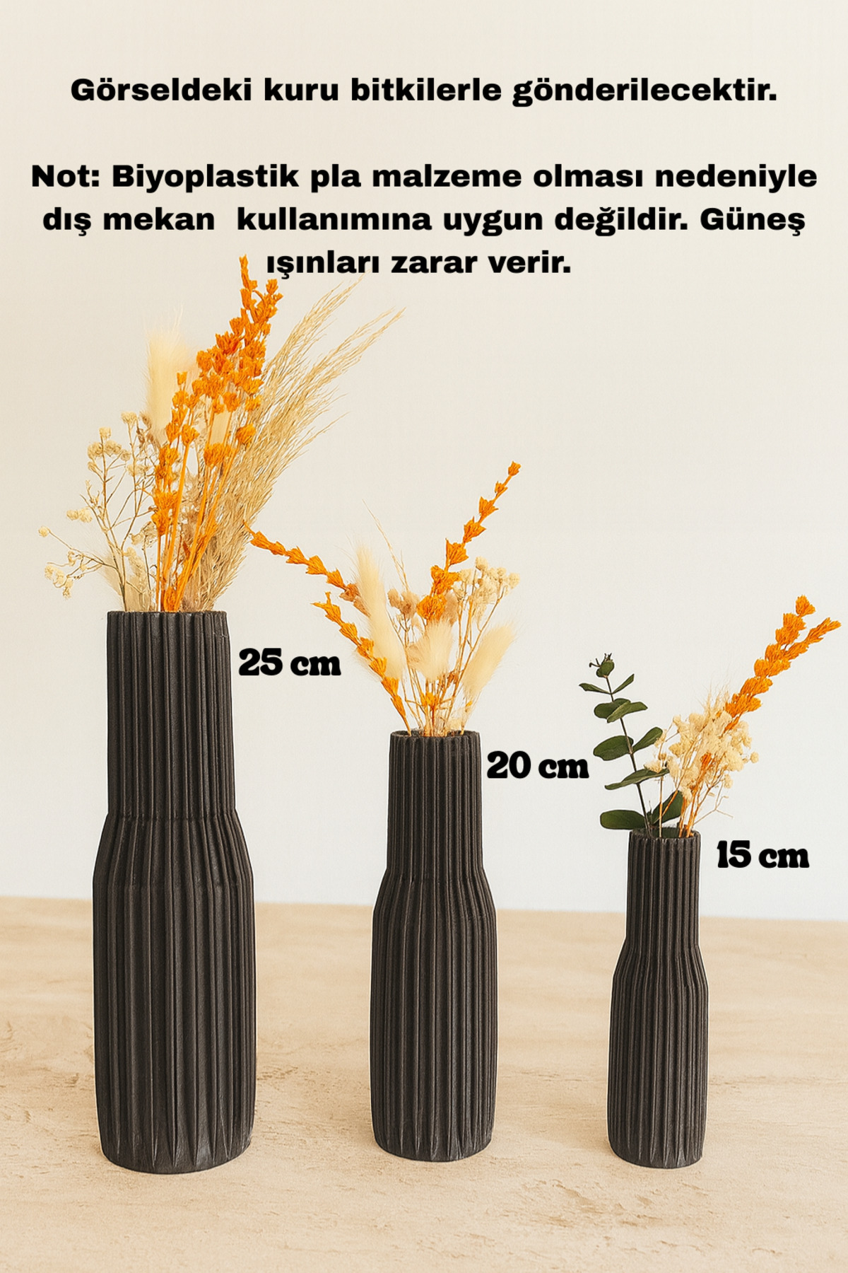 Üçlü Paris Vazo SetBüyük boy:25 cmOrta boy: 20 cmKüçük boy: 15 cmMinimalist tasarımı ve modern çizgileriyle öne çıkan bu çizgili dekoratif vazolar, evinizin her köşesine doğal bir şıklık katıyor.; Özel dokulu yüzeyi sayesinde sade ama zarif bir görünüm sunar.; •Malzeme: 3D baskı teknolojisi ile çevre dostu ve dayanıklı malzemelerden üretilmiştir.; •Renk: Toprak tonları ile sıcak ve doğal bir atmosfer yaratır.; •Kullanım Alanı: Salon, yatak odası, ofis veya özel köşelerinizde dekoratif obje olarak kullanabilirsiniz.; •Bitki Uyumları: Kuru çiçek, pampas otu, buğday ve minimalist dallarla mükemmel uyum sağlar.; Hem tek başına hem de set halinde kullanıldığında mekânınıza modern ve doğal bir dokunuş katar.; Görseldeki kuru bitkiler ile gönderilecektir.